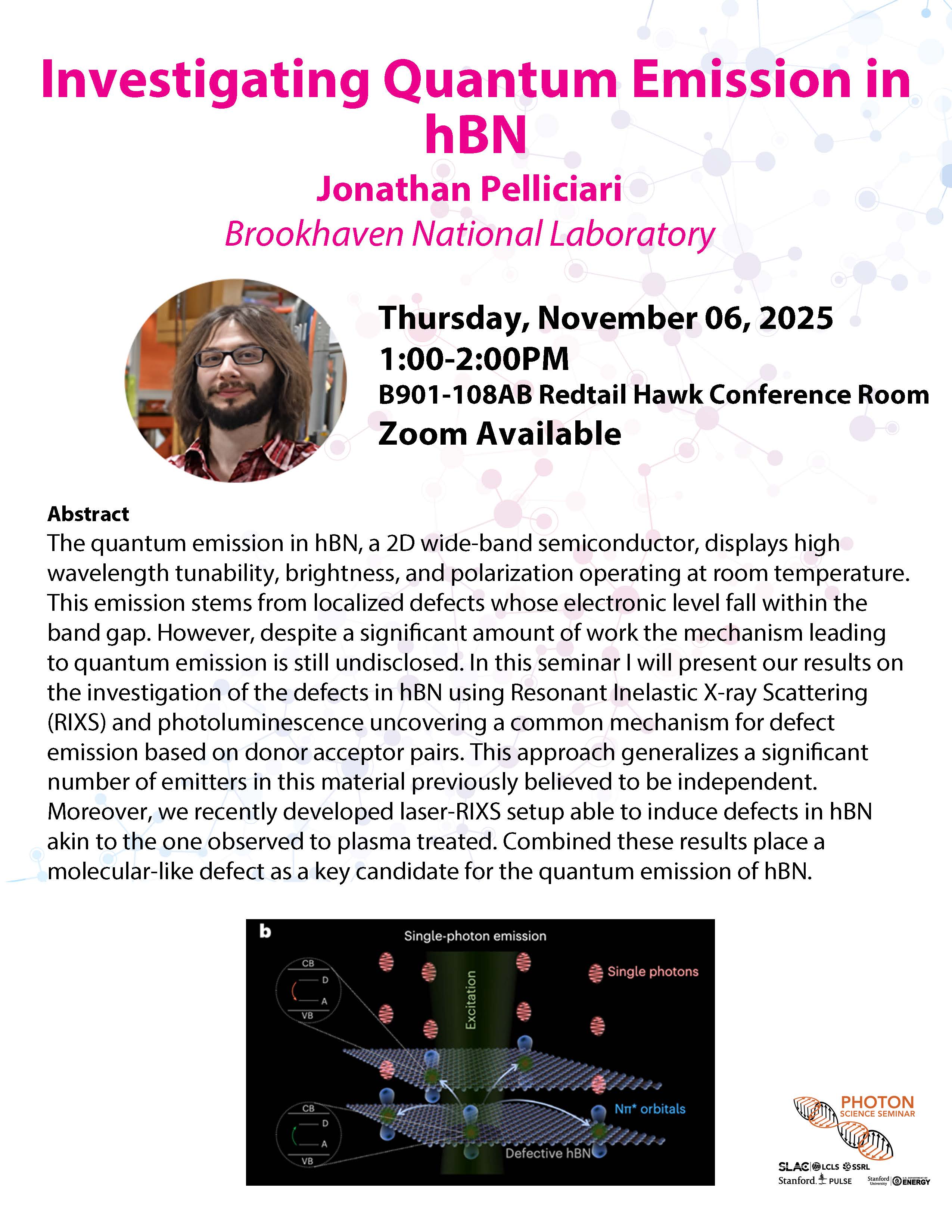 The quantum emission in hBN, a 2D wide-band semiconductor, displays high wavelength tunability, brightness, and polarization operating at room temperature. This emission stems from localized defects whose electronic level fall within the band gap. However, despite a significant amount of work the mechanism leading to quantum emission is still undisclosed. In this seminar I will present our results on the investigation of the defects in hBN using Resonant Inelastic X-ray Scattering (RIXS) and photoluminescence uncovering a common mechanism for defect emission based on donor acceptor pairs. This approach generalizes a significant number of emitters in this material previously believed to be independent. Moreover, we recently developed laser-RIXS setup able to induce defects in hBN akin to the one observed to plasma treated. Combined these results place a molecular-like defect as a key candidate for the quantum emission of hBN.